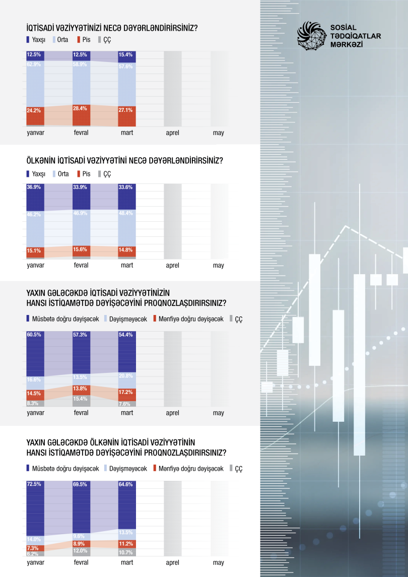 Mart ayı üzrə sorğu nəticələrinə əsasən, iştirakçıların 15.4%-i iqtisadi vəziyyətini “yaxşı”, 57.6%-i “orta”, 27.1%-i “pis” kimi qiymətləndirib.